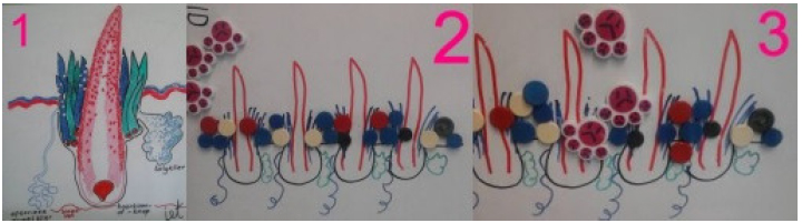 Het eerste plaatje is een haarzakje waarin de dekhaar rood is ingetekend.